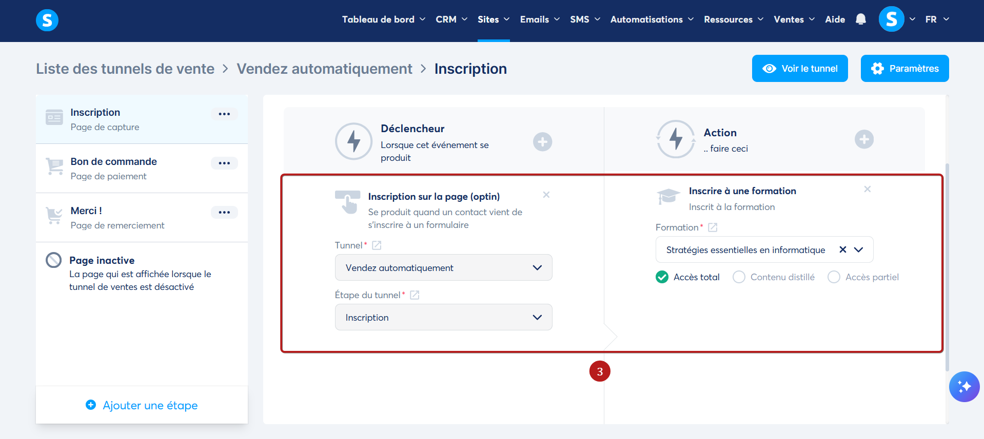 b. ajouter une règle d'automatisation qui aura comme déclencheur "Inscription sur la page (optin)" et comme action "Inscrire a une formation" (3).