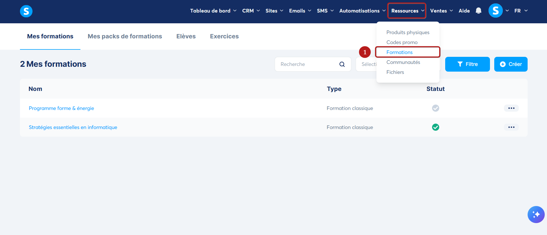 Dans le menu, cliquez sur "Ressources", puis "Formations" (1).
