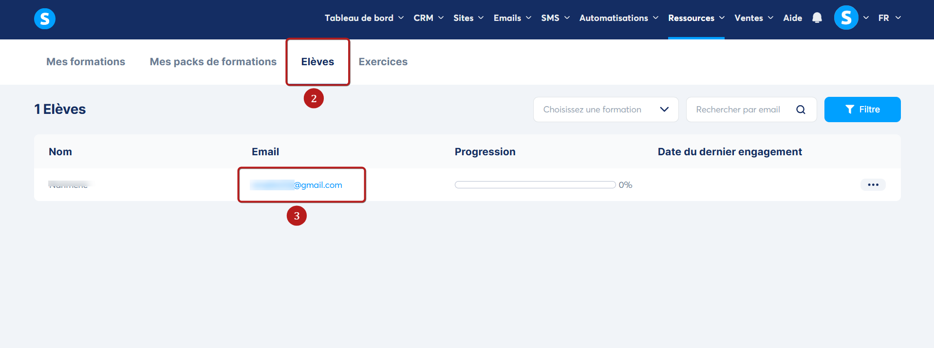 Allez dans l'onglet "Élèves" (2). La liste de vos étudiants s'affiche. Accédez à la fiche de l'élève concerné en cliquant sur son adresse email (3).