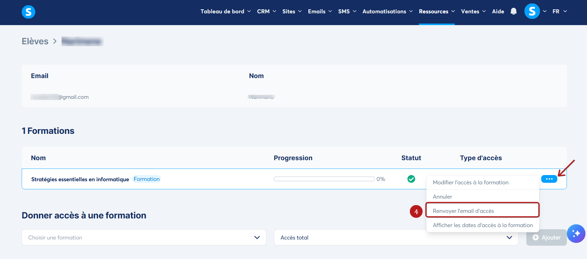 Sur la fiche de l'élève, repérez la formation pour laquelle vous souhaitez renvoyer l'accès. Cliquez sur les 3 points, puis sélectionnez "Renvoyer l'email d'accès" (4).