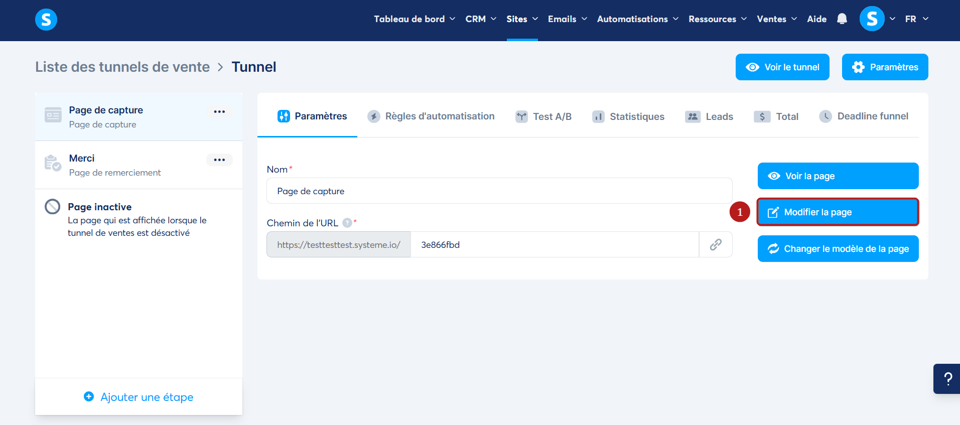 Dirigez-vous vers votre tunnel de vente où se trouve votre page, puis allez dans l'éditeur de la page en cliquant sur "Modifier la page" (1).