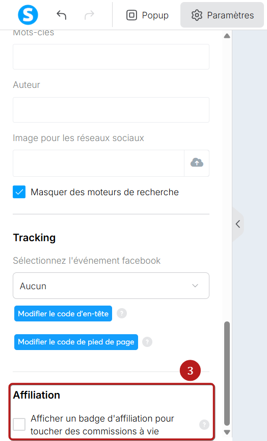 Descendez en bas des paramètres et vous trouverez une case à cocher "Afficher un badge d'affiliation pour toucher des commissions à vie" (3).