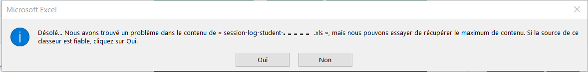 Dans le cas où vous exportez le journal d'activité d'un élève et que vous trouvez le fichier endommagé, il faut d'abord s'assurer de ne pas avoir utilisé des caractères spéciaux "émojis" dans le titre de la formation, le titre d'un chapitre ou module, car le format (.xls) ne supporte pas ces caractères.