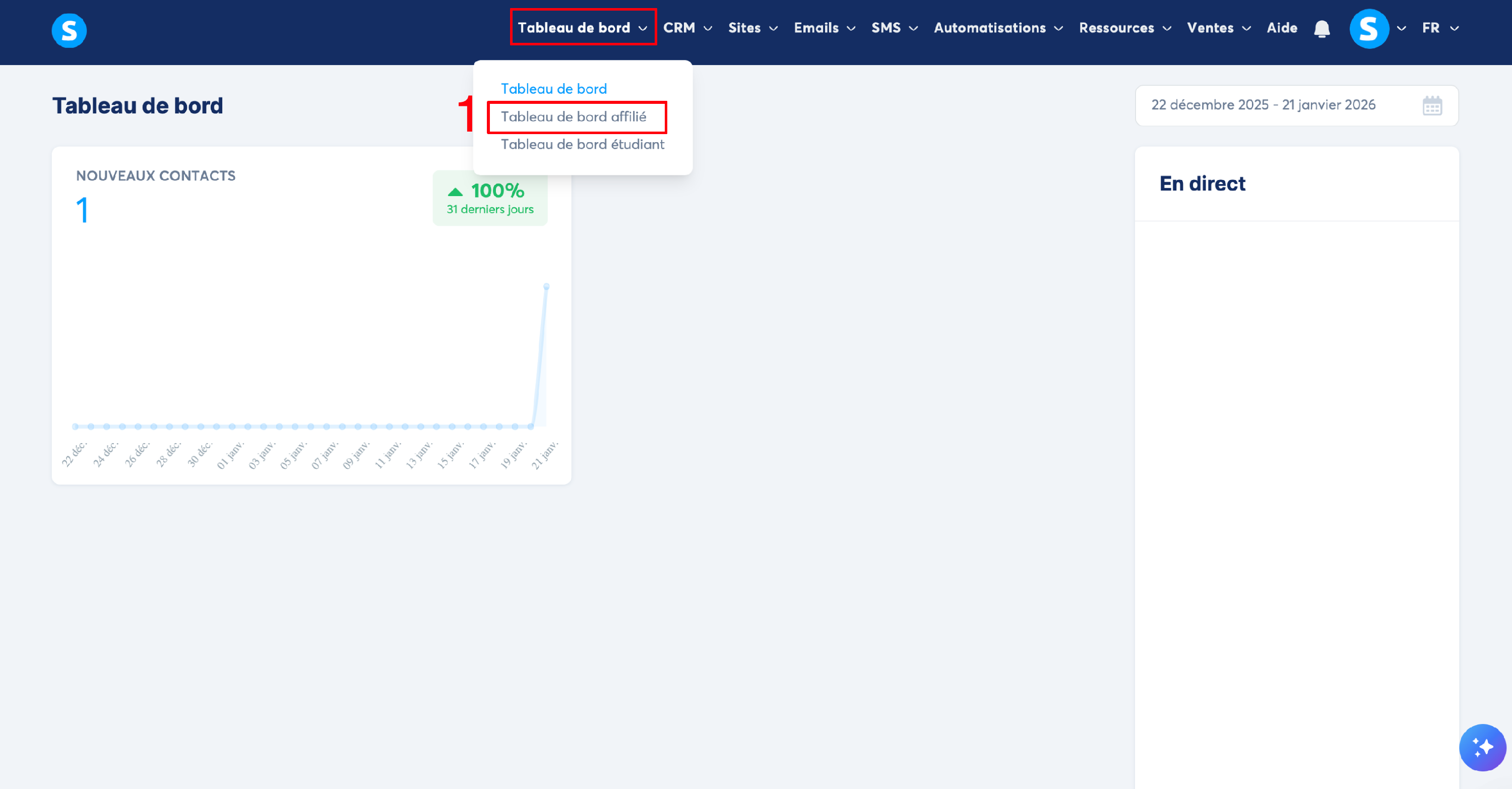 Pour retrouver votre identifiant affilié ainsi que vos différents liens d'affiliation, allez dans " Tableau de bord " ensuite"Tableau de bord affilié" ( 1 )