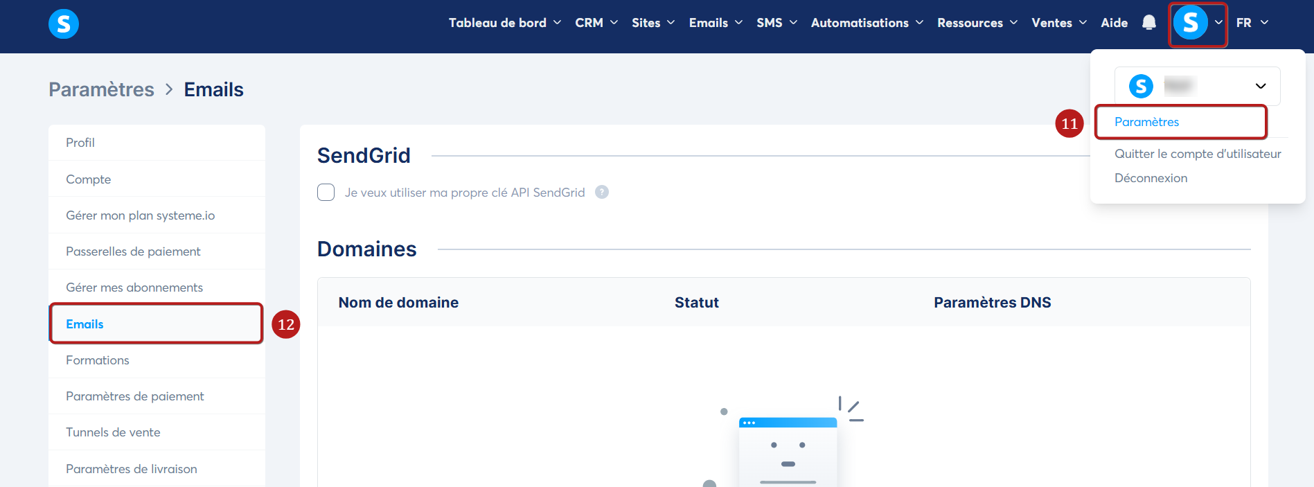 Cliquez sur votre photo de profil, puis sur "Paramètres" (11), sélectionnez ensuite "Emails" (12).