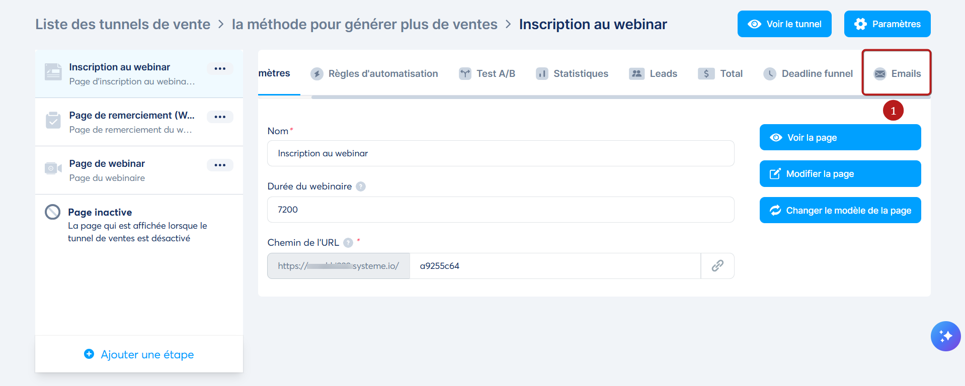 Accédez à votre page d'inscription au webinaire et cliquez sur l'onglet "Emails" (1).