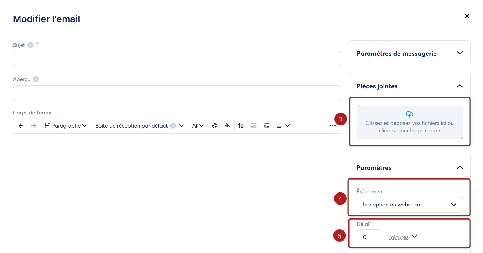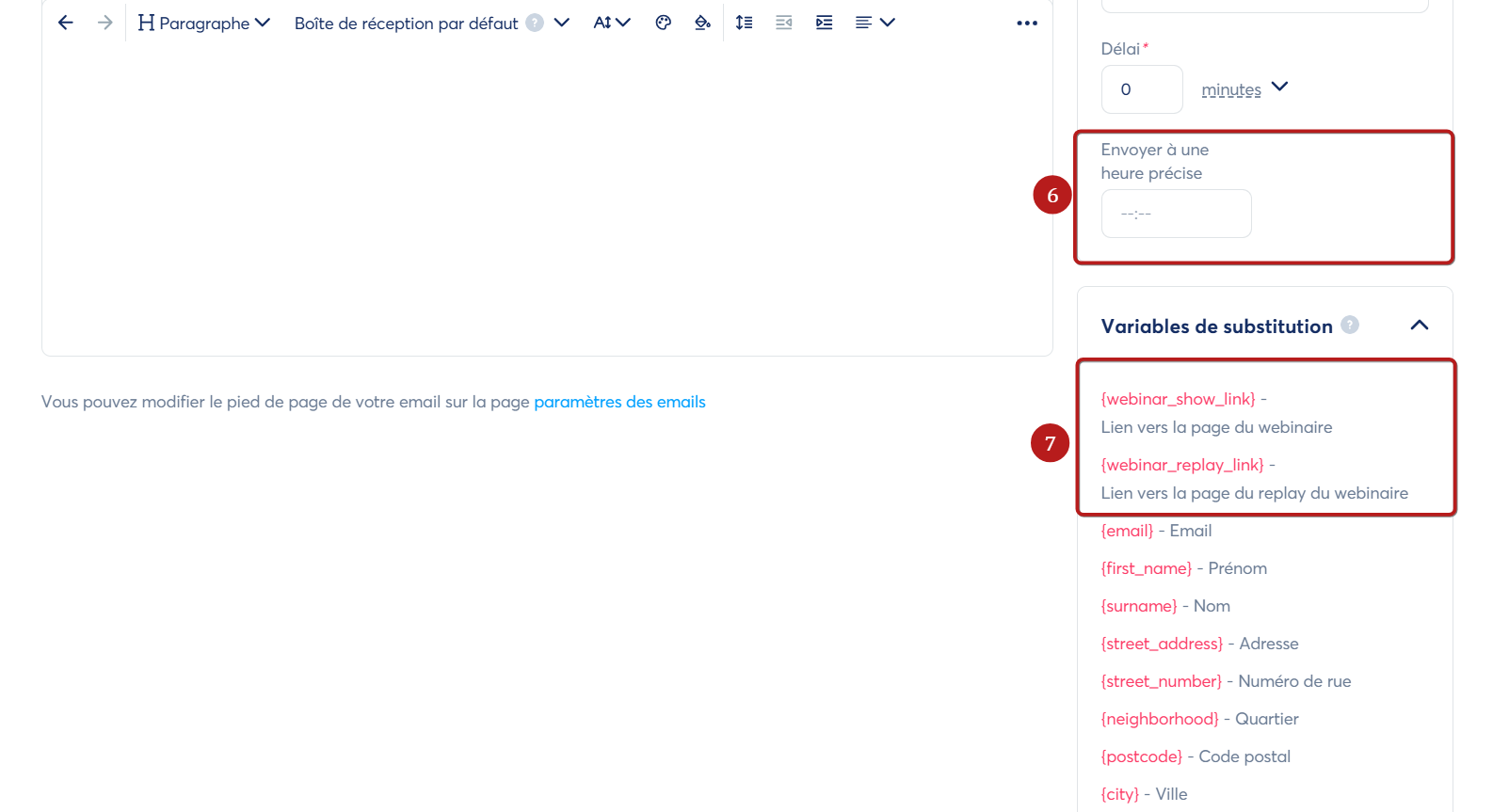 - Définir un délai avant l'envoi de l'email (par exemple si vous souhaitez que vos participants reçoivent l'email15 minutes avant le début du webinaire) (5).