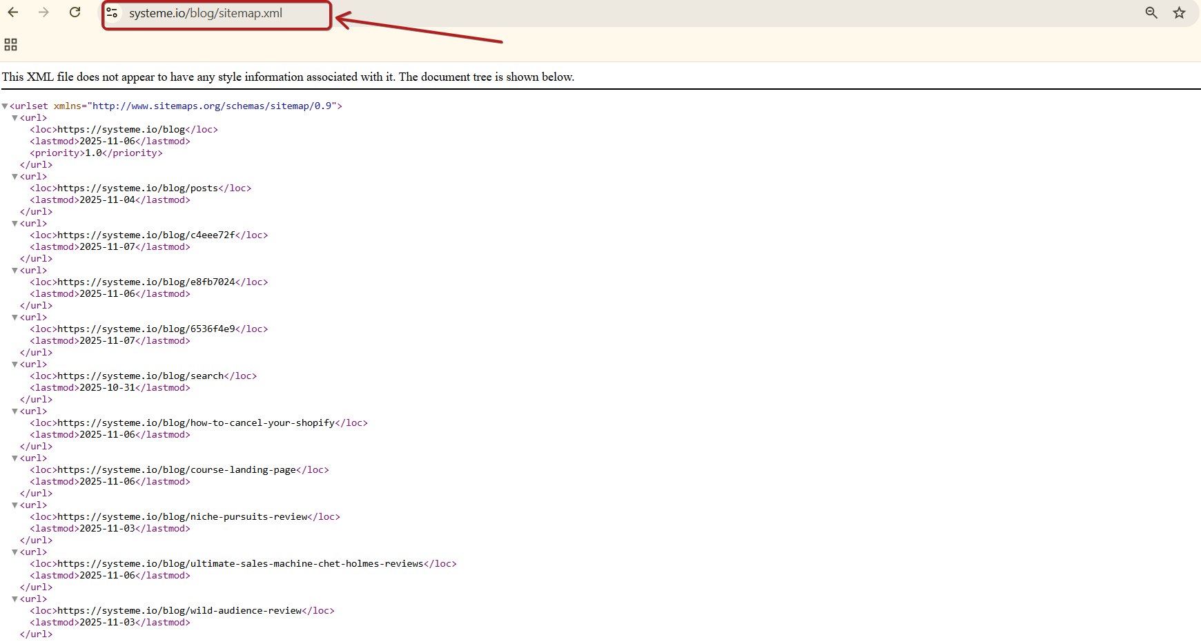 Chaque blog crée sur systeme.io a un sitemap auquel vous pouvez accéder en saisissant l'URL de votre site dans le navigateur, puis ajoutez " /sitemap.xml " à l'URL et lancez une recherche sur l'URL final obtenu.