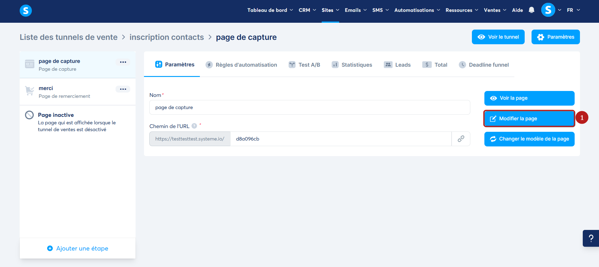Rendez-vous dans le tunnel de vente contenant votre page, puis ouvrez l'éditeur en cliquant sur "Modifier la page" (1).
