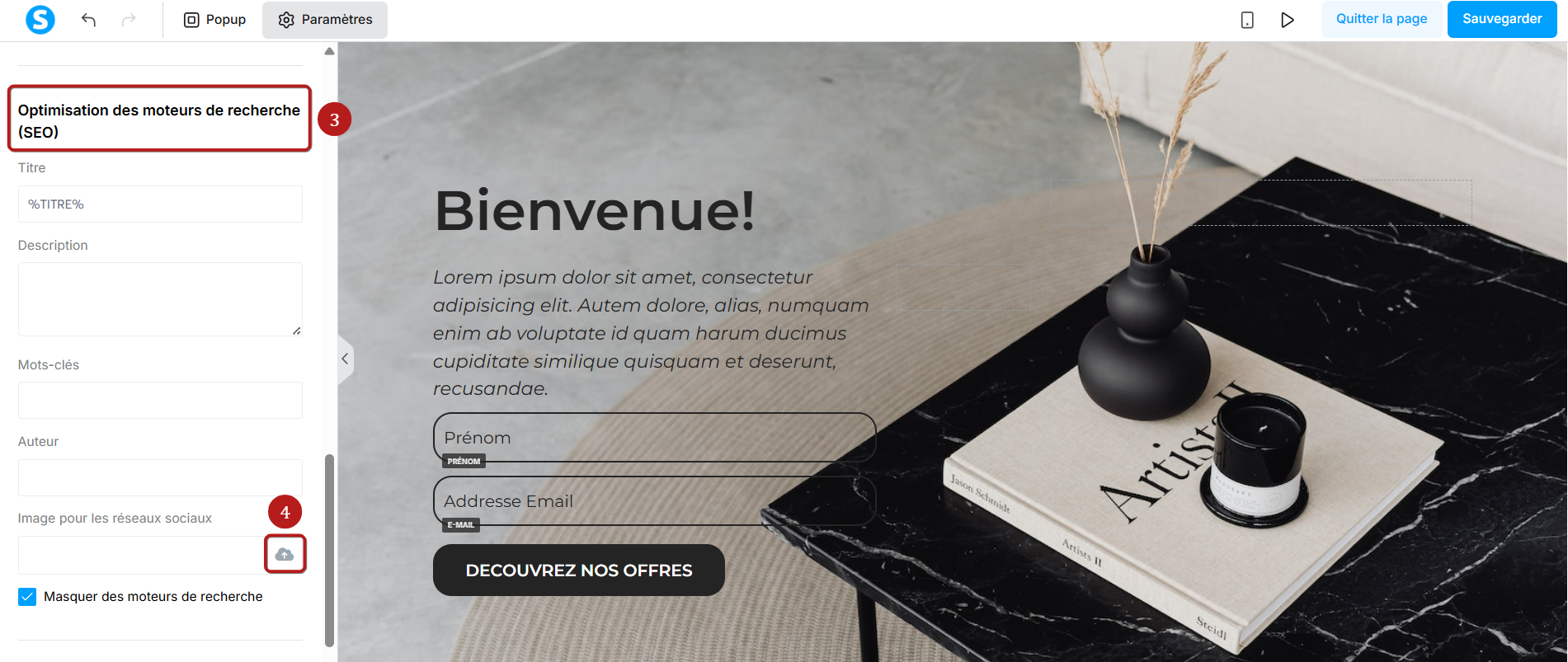 Vous y trouverez un champ pour charger l'image qui apparaîtra sur les réseaux sociaux (4). Cliquez dessus pour choisir ou téléverser l'image de votre choix.