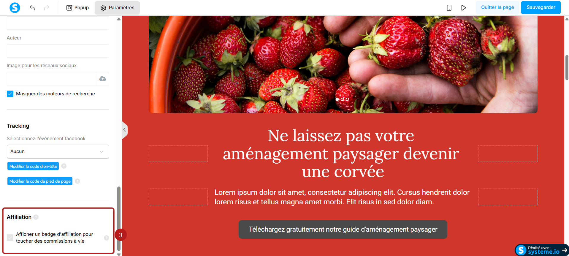 Remarque : les prospects qui cliquent sur ce badge seront redirigés vers votre lien affilié pour promouvoir systeme.io et gagner 60% de commissions à vie.