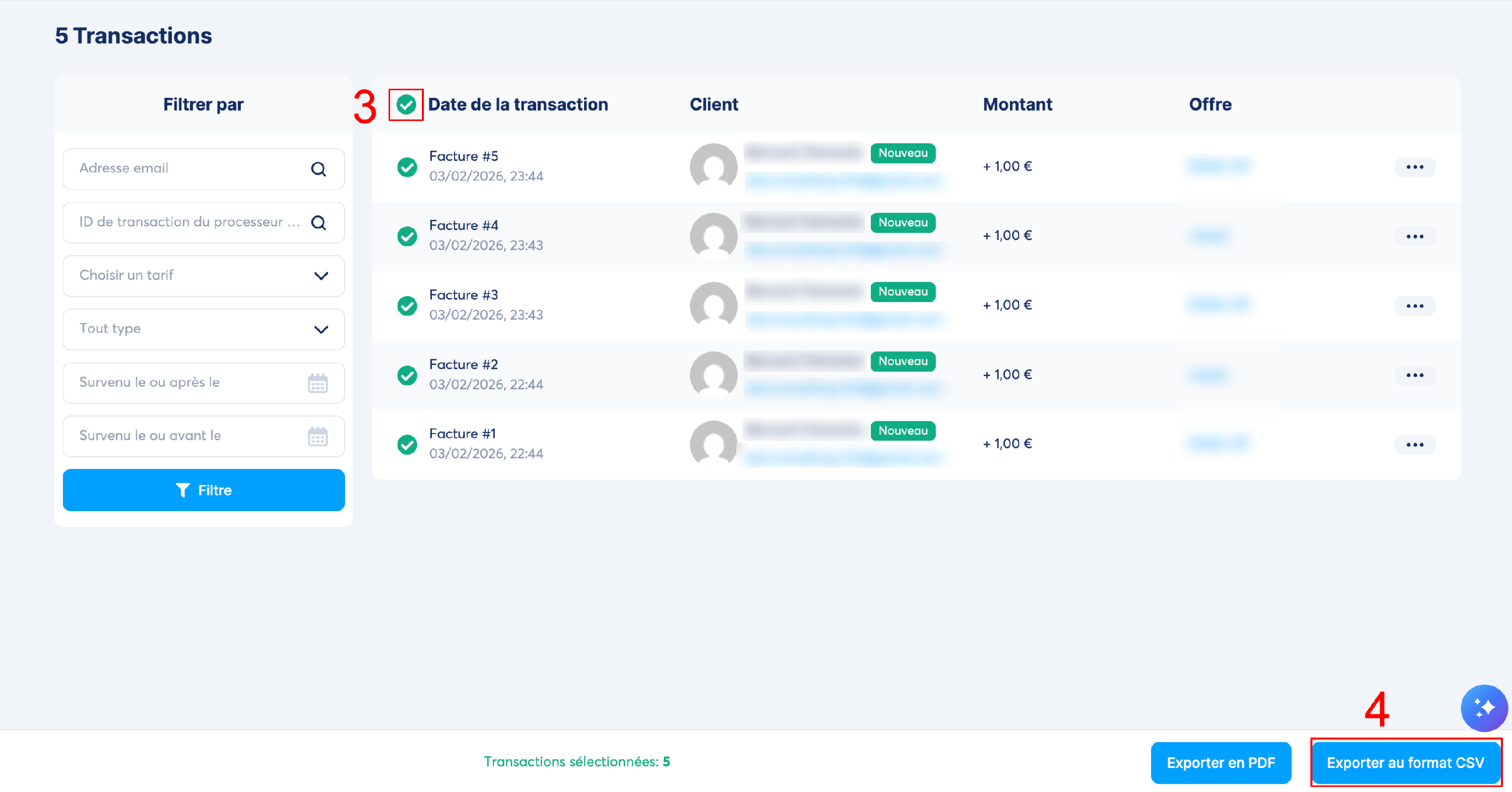 Une fois au niveau des transactions, vous pouvez sélectionner l'ensemble des transactions (numéro 3 sur l'image), ou sélectionner les transactions que vous désirez avoir sur le fichier de l'exportation, ensuite cliquer sur "Exporter au format CSV". (numéro 4 sur l'image)