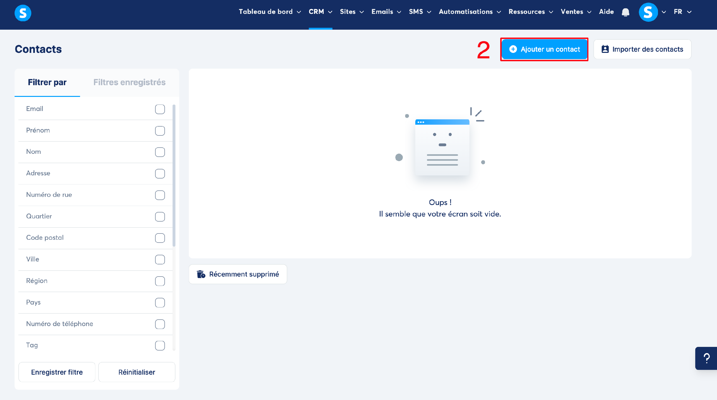 Dirigez-vous vers l'onglet "CRM", puis cliquez sur "Contacts". (numéro 1 sur l'image)