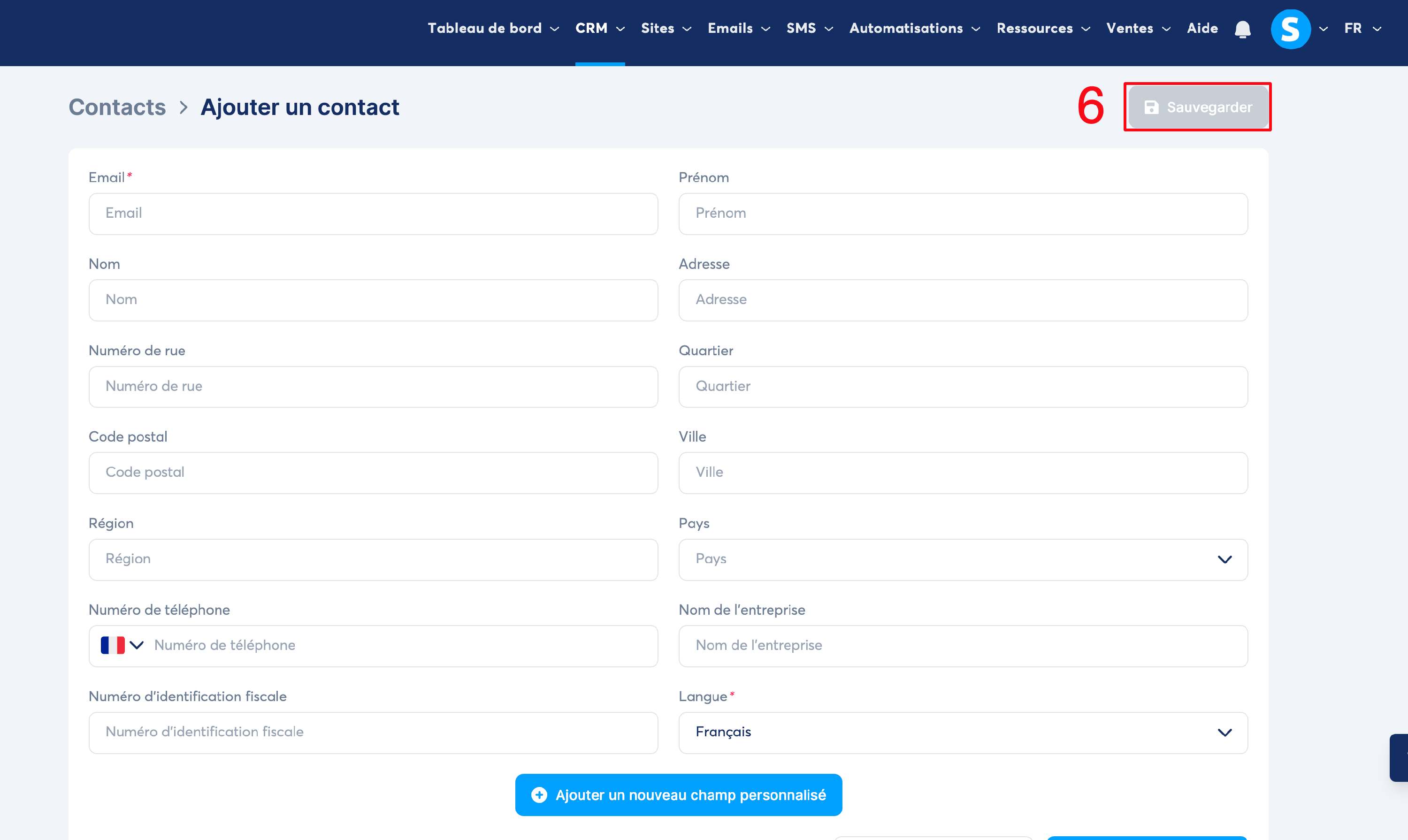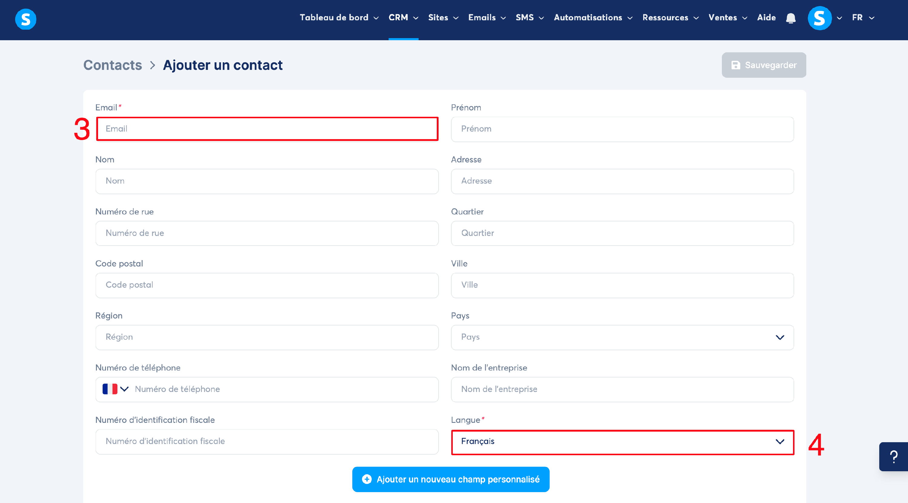 Remplissez au moins les deux champs obligatoires "Email" (numéro 3 sur l'image) et "Langue" (numéro 4 sur l'image) sur la fiche du nouveau contact.