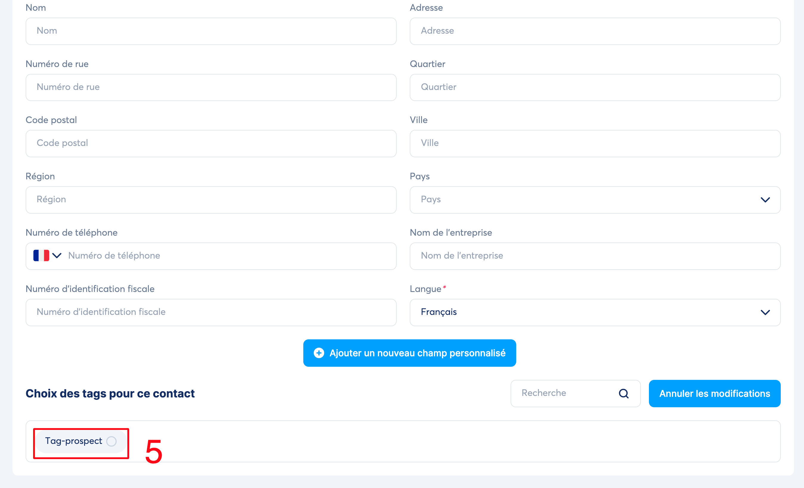 Vous avez la possibilité d'associer un tag au moment où vous ajoutez le contact, en cochant le tag souhaité (numéro 5 sur l'image),