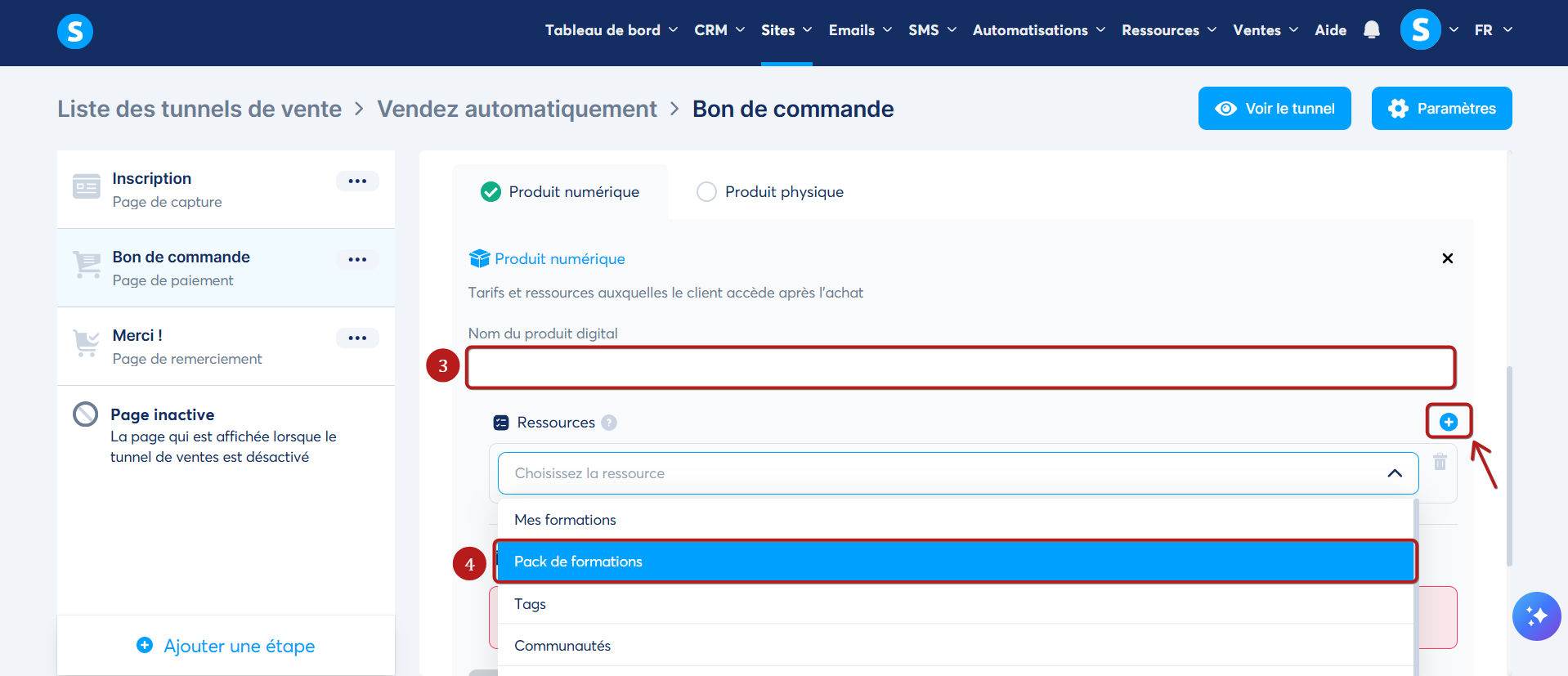 Après avoir créé un nouveau produit numérique, vous devez lui attribuer un nom en remplissant le champ "Nom du produit digital" (3). Par la suite, cliquez sur l'icône "+Plus" pour ajouter une ressource à votre offre, puis sélectionnez "Pack de formations" (4).
