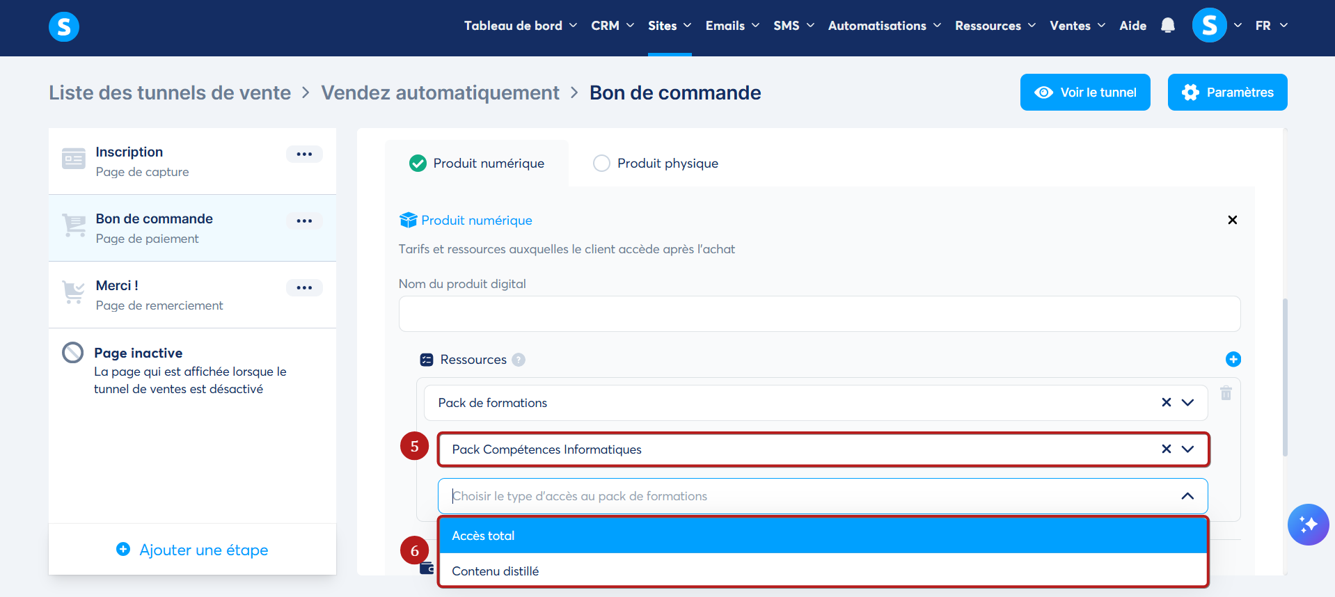 Le menu déroulant des packs disponibles s'affichera, il ne vous reste qu'à sélectionner le pack (5), puis choisir le type d'accès souhaité pour votre pack : "accès total ou contenu distillé" (6).
