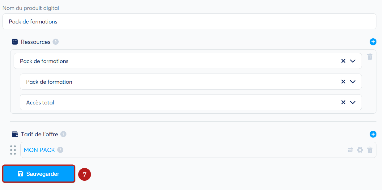 Enfin, après avoir créé la ressource sur la page de paiement, vous devez enregistrer les modifications en cliquant sur le bouton "Sauvegarder" (7).