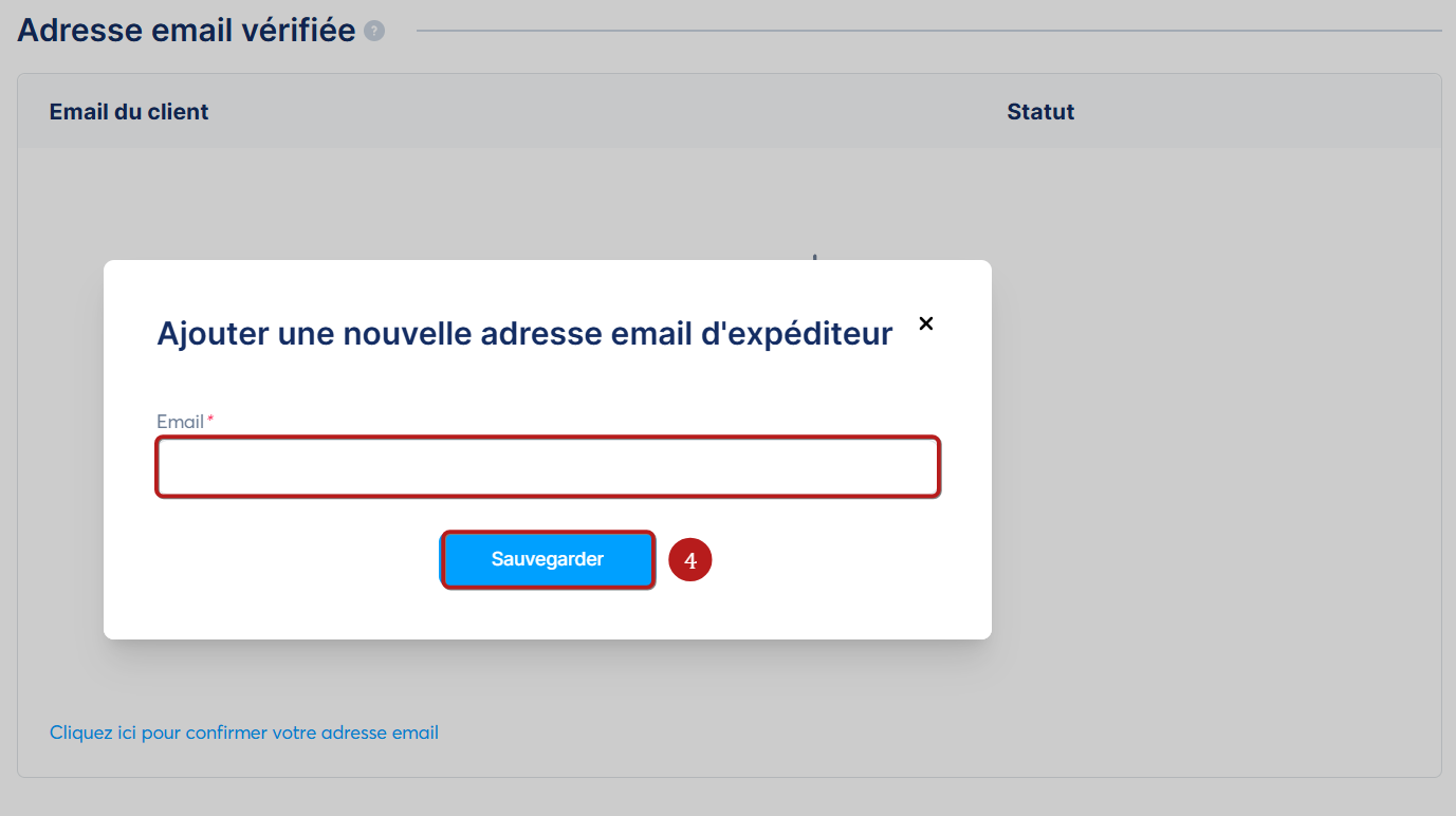 Une fenêtre popup s'affichera. Entrez votre adresse email d'expédition, puis cliquez sur "Sauvegarder" (4).