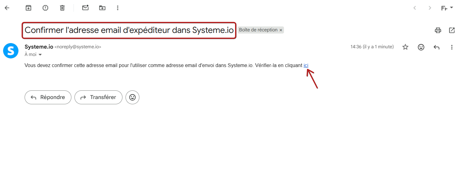 Allez dans votre boîte de réception, puis cliquez sur le lien de confirmation présent dans l'email intitulé "Confirmer l'adresse email de l'expéditeur dans systeme.io".
