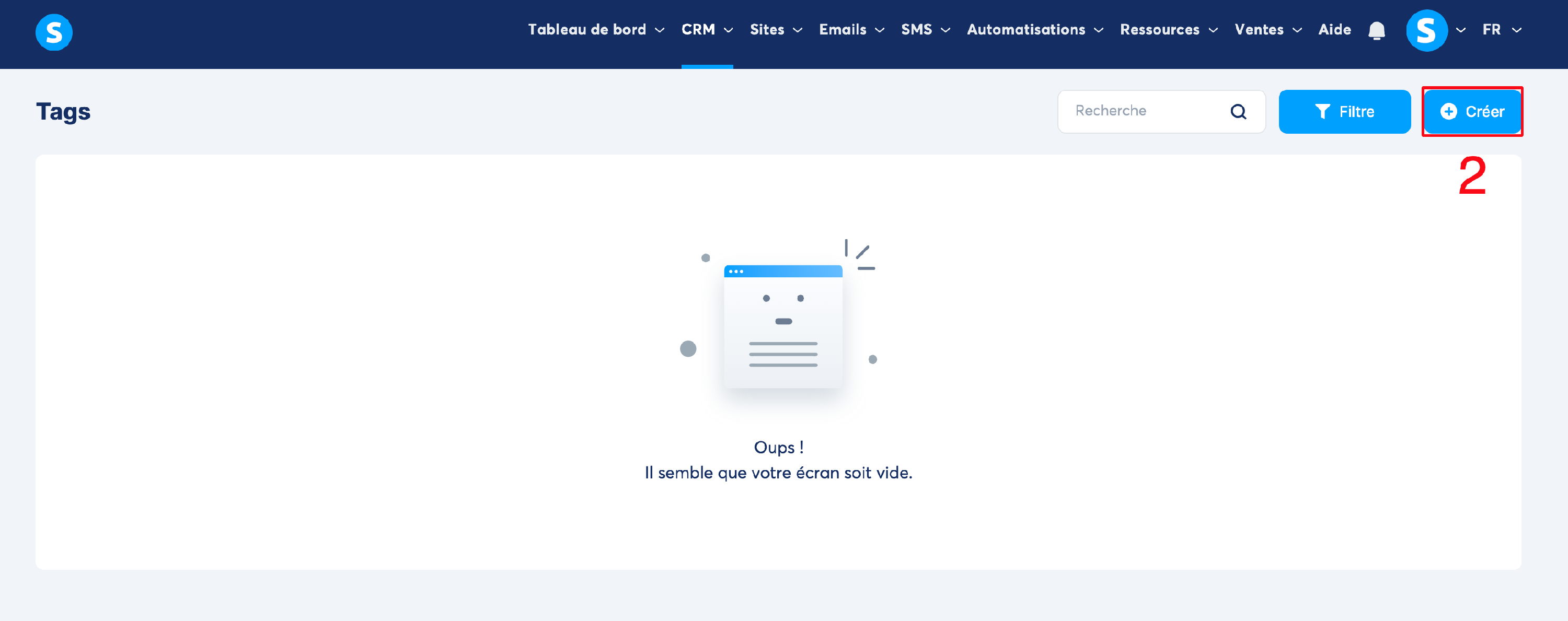 Pour créer un tag, allez dans la section "CRM", ensuite vers "Tags". (numéro 1 sur l'image)