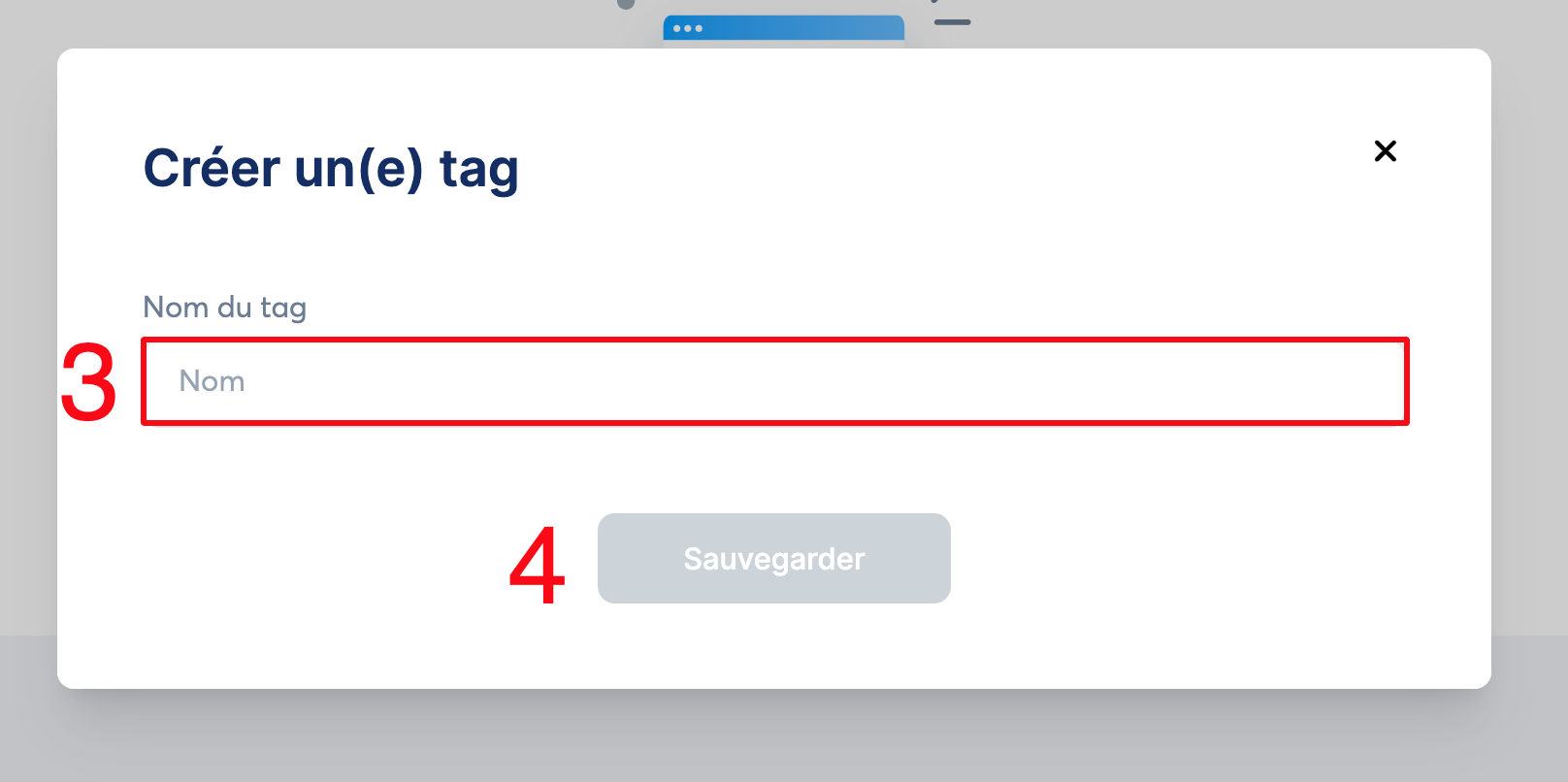 Remplissez les champs "Nom du tag" (numéro 3 sur l'image), puis cliquez sur "Sauvegarder" pour enregistrer le nouveau tag. (numéro 4 sur l'image)