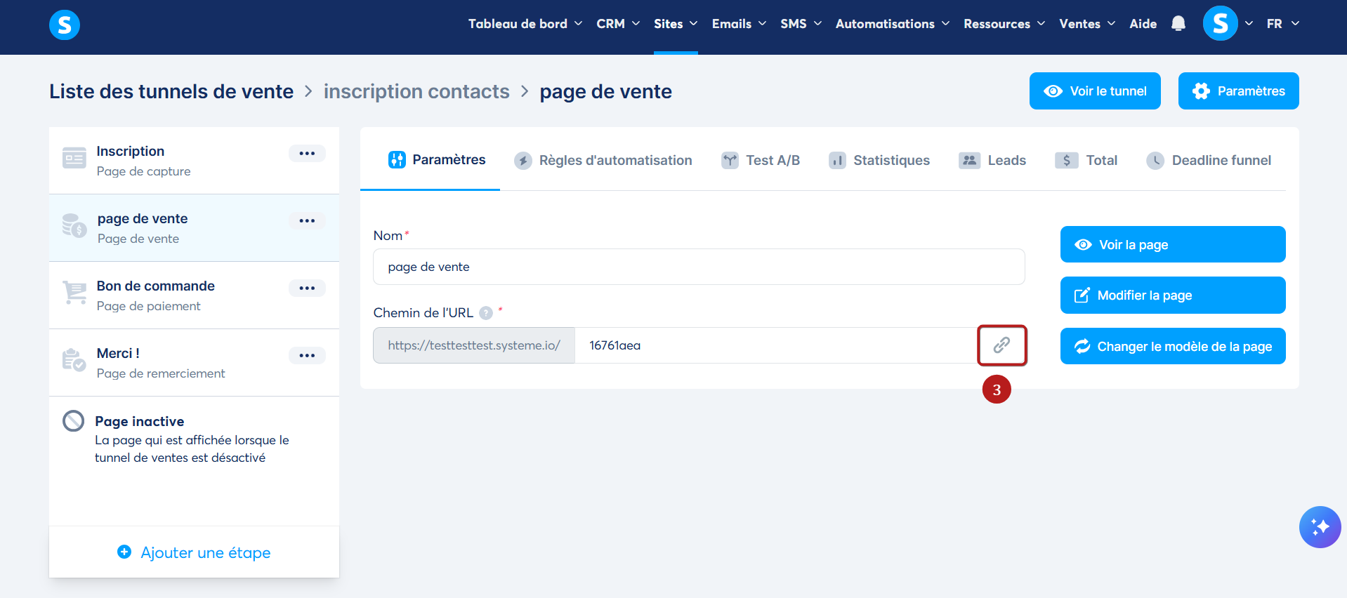 Ensuite, vous allez copier le lien de votre page (numéro 3 de l'image)