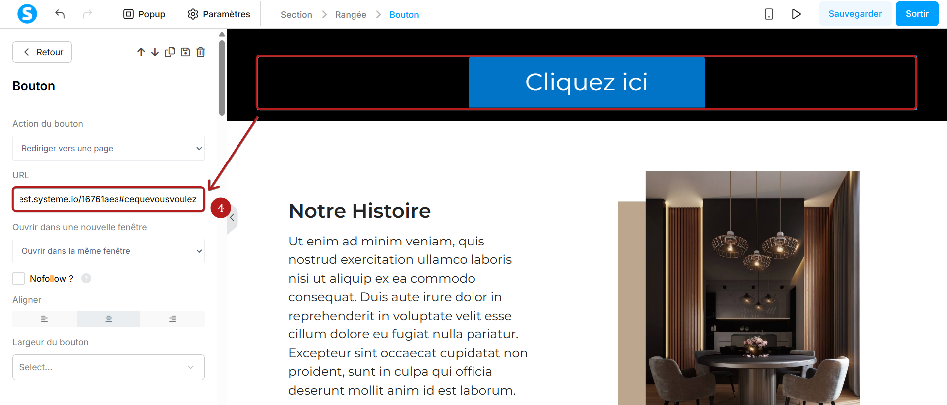Une fois vous avez copié le lien, vous allez ajouter un bouton en haut de la page, que vous allez paramétrer en mettant l'URL de votre page suivi immédiatement de #AttributID, soit #row-c6d67b90 (numéro 5 de l'image)