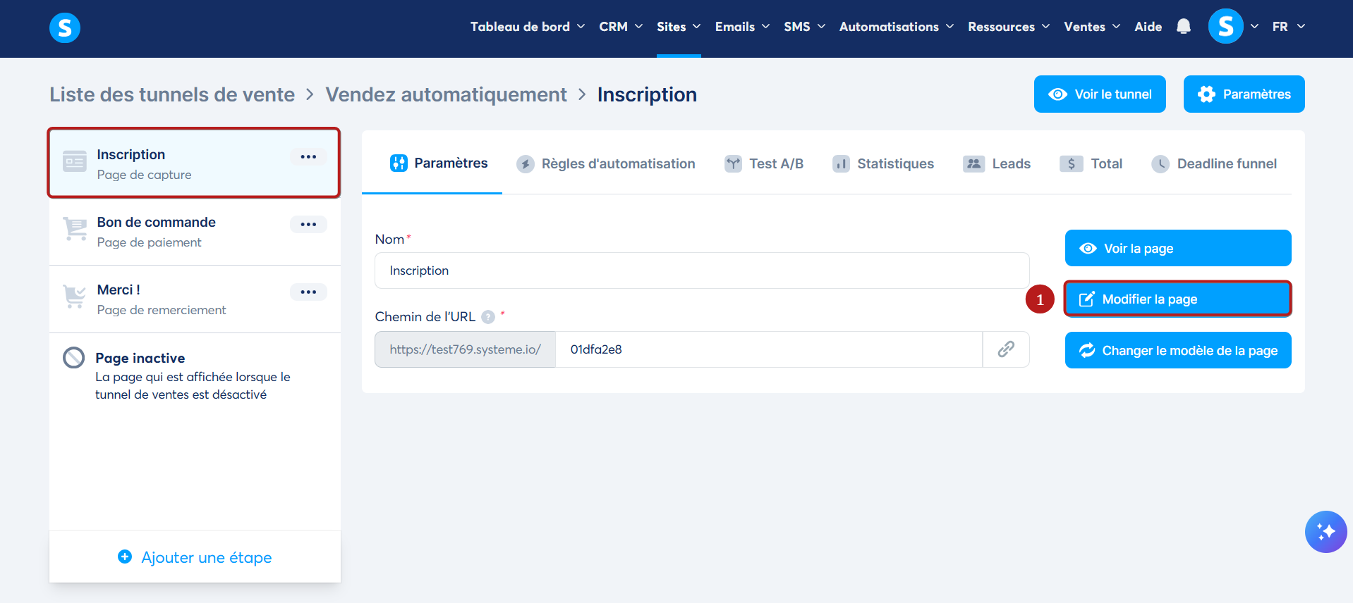 1. Accédez à l'éditeur de la page contenant votre formulaire en cliquant sur "Modifier la page" (1).