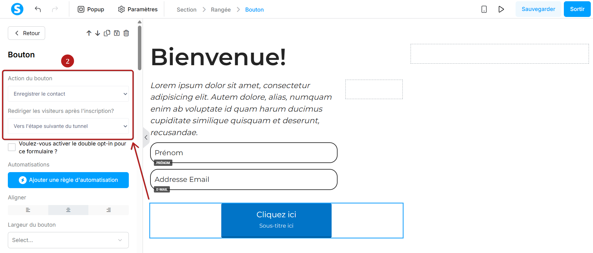 2. Configurez le bouton de votre formulaire pour que son action soit d'enregistrer le contact d'abord, puis choisissez une redirection vers la page de votre choix (2).
