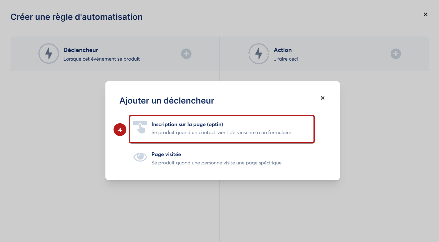 4. Choisissez le déclencheur "Inscription sur la page (optin)" (4).