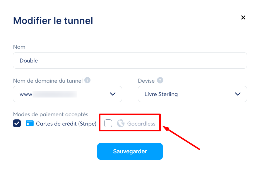 Après avoir rempli les formulaires, activez la méthode de paiement GoCardless dans les paramètres de votre tunnel de vente en cliquant sur la case à cocher Gocardless.