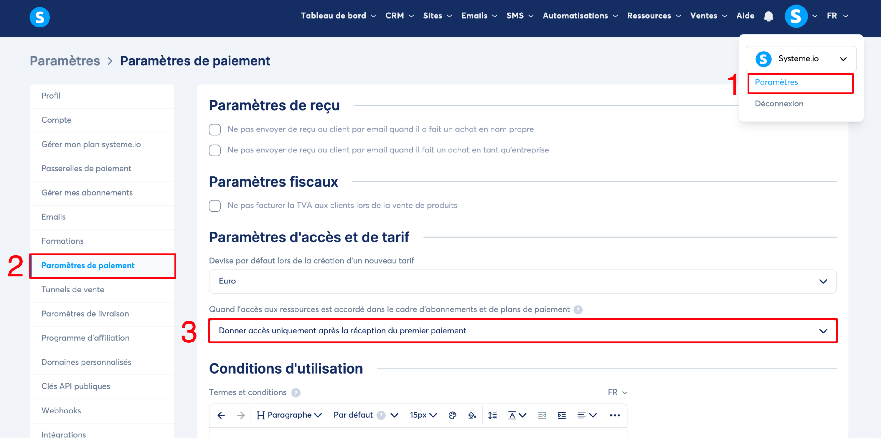 Pour le faire sur votre compte systeme.io, il suffit de vous diriger vers votre photo de profil, cliquer sur "Paramètres". ( 1 )