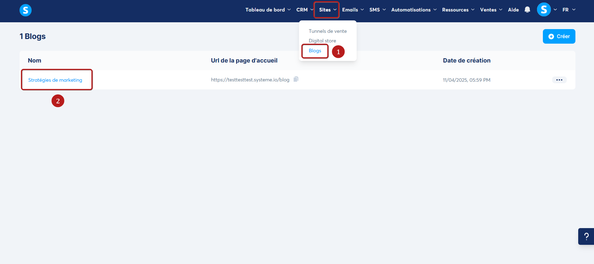 Allez dans Blogs dans l’onglet Sites (1), puis cliquez sur le titre de votre blog (2).