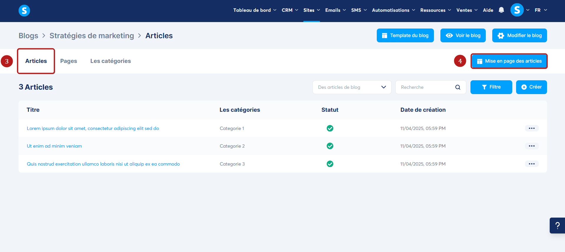 Une fois dans le menu de votre Blog, allez d'abord dans la section "Articles" (3), puis cliquez sur "Mise en page des articles" (4).