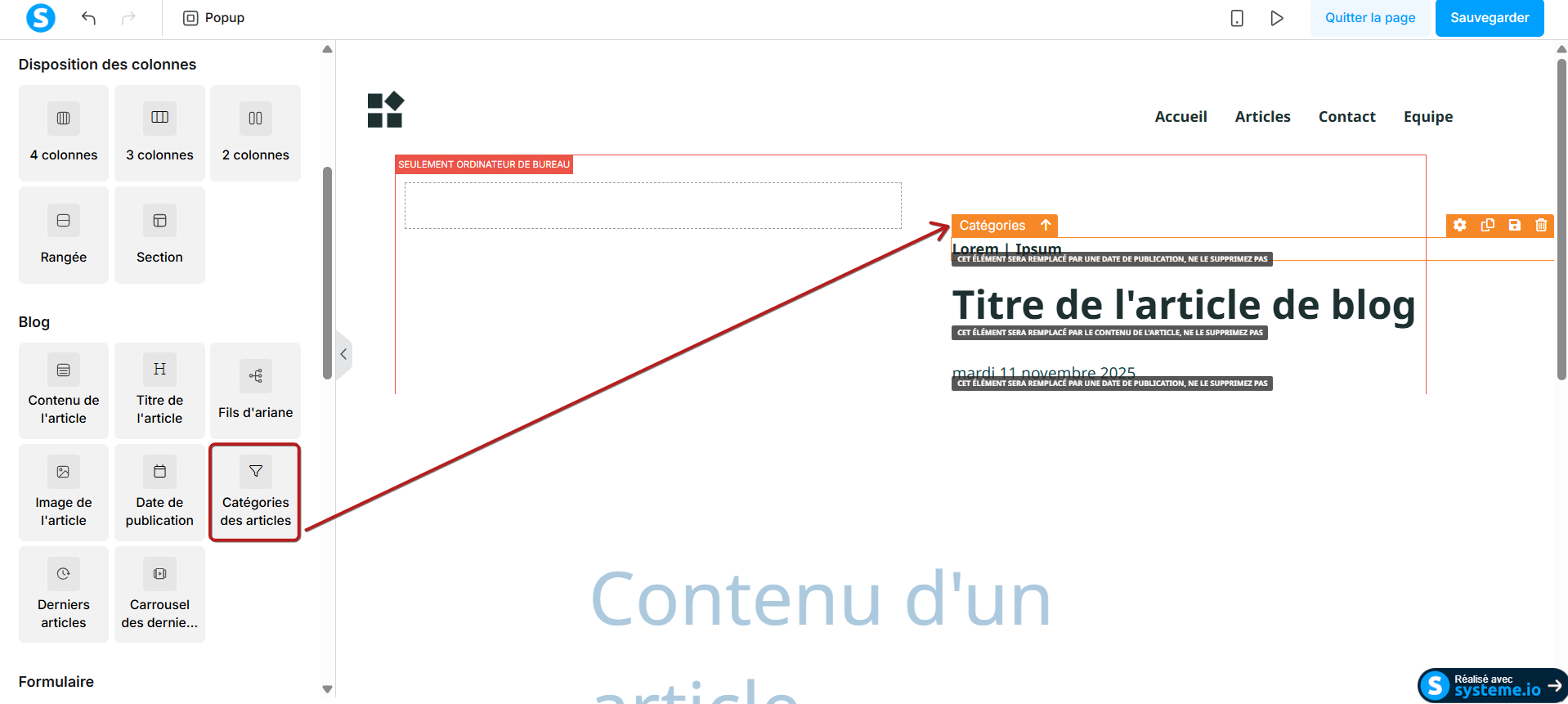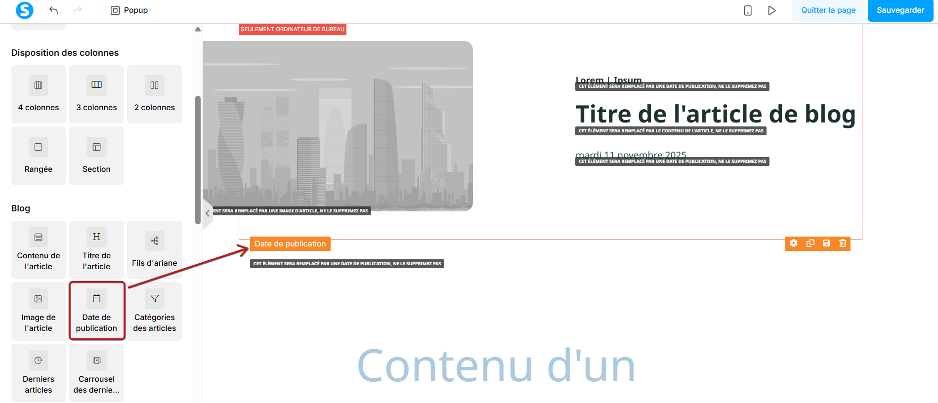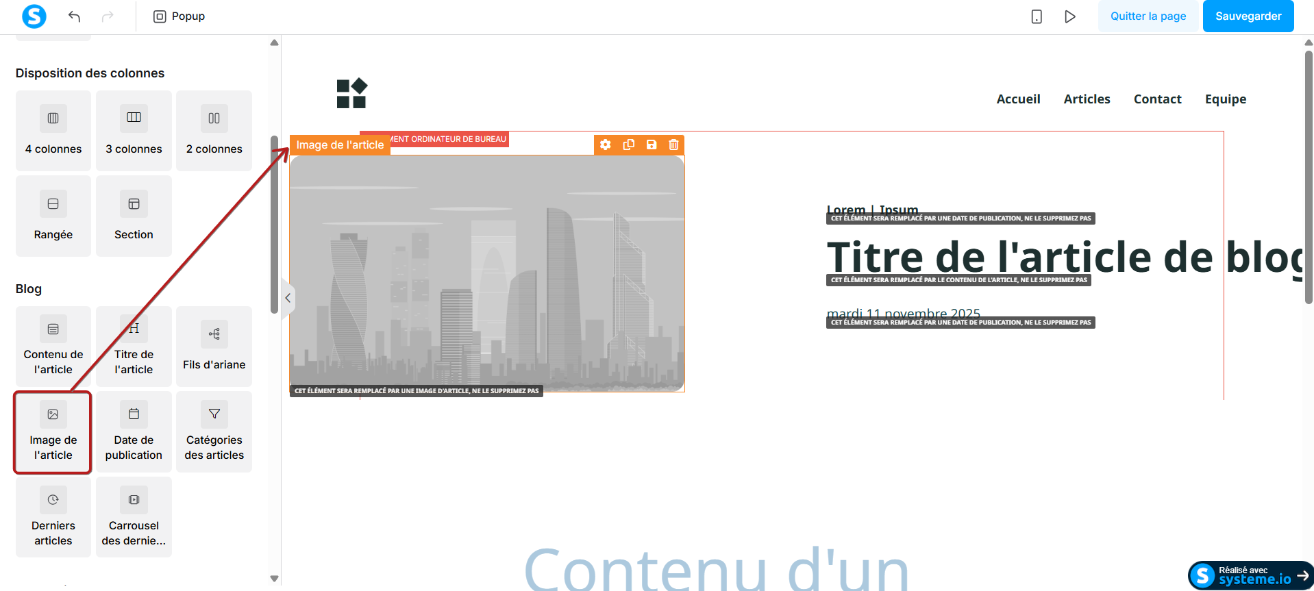Le principe de la mise en page d'un article de blog est le même que le modèle d'un blog, l'idée est qu'à partir des paramètres de gestion du modèle d'article, vous mettez en place les éléments/mise en page de vos articles.