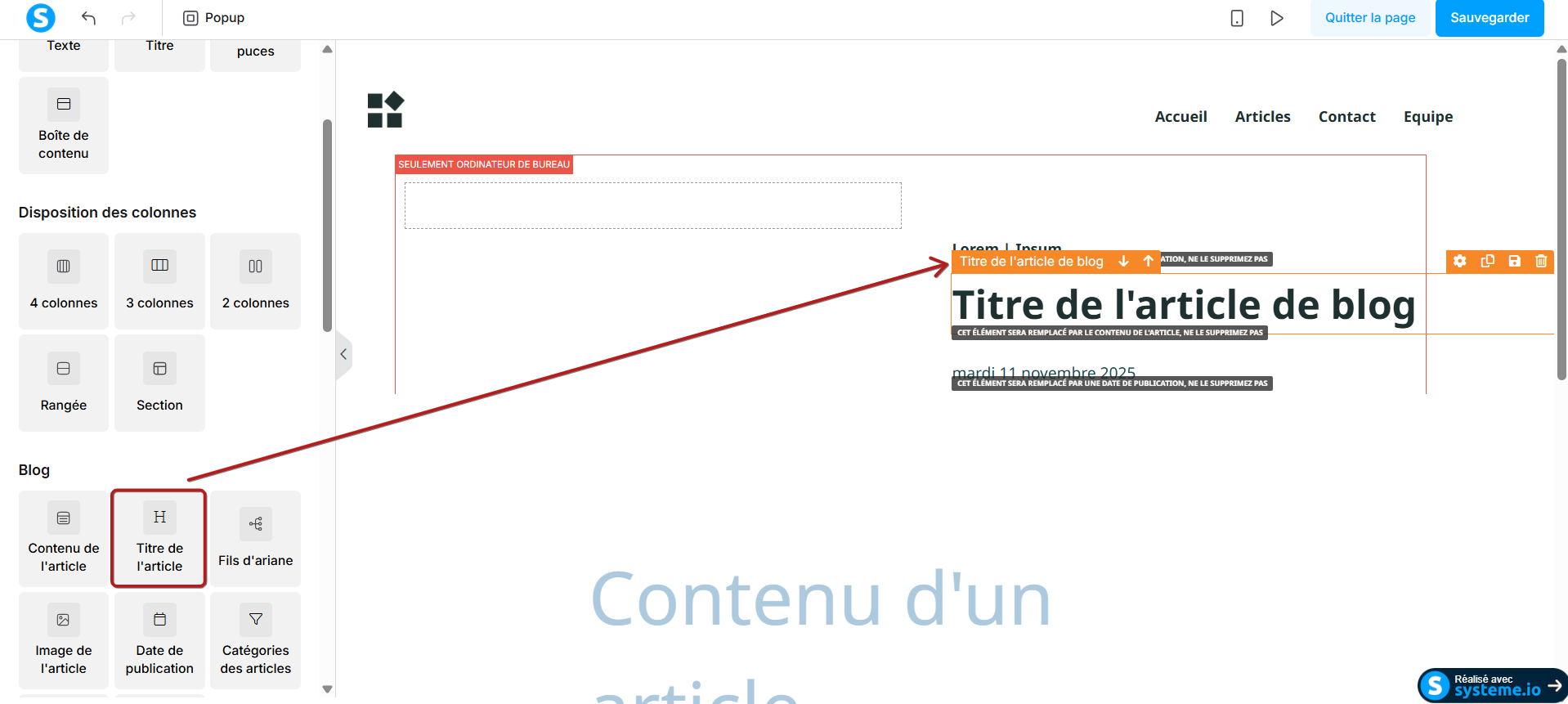 2. Titre de l'article : cet élément sera remplacé automatiquement par le titre donné à votre article lors de sa création.