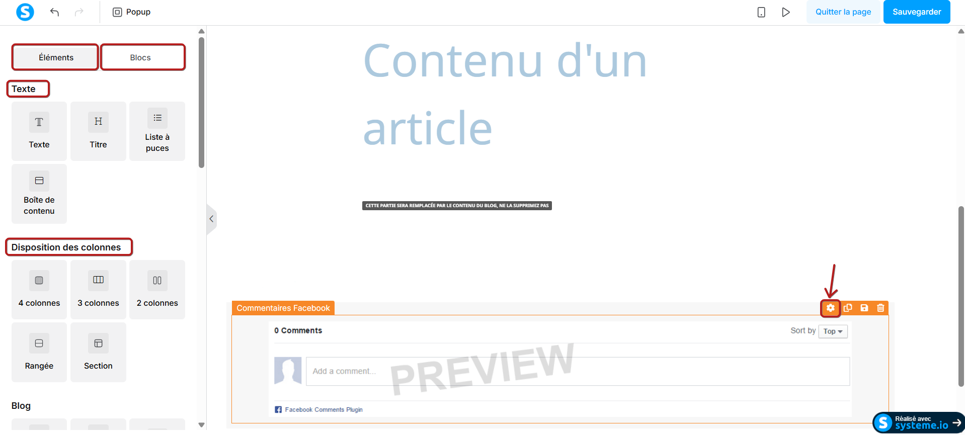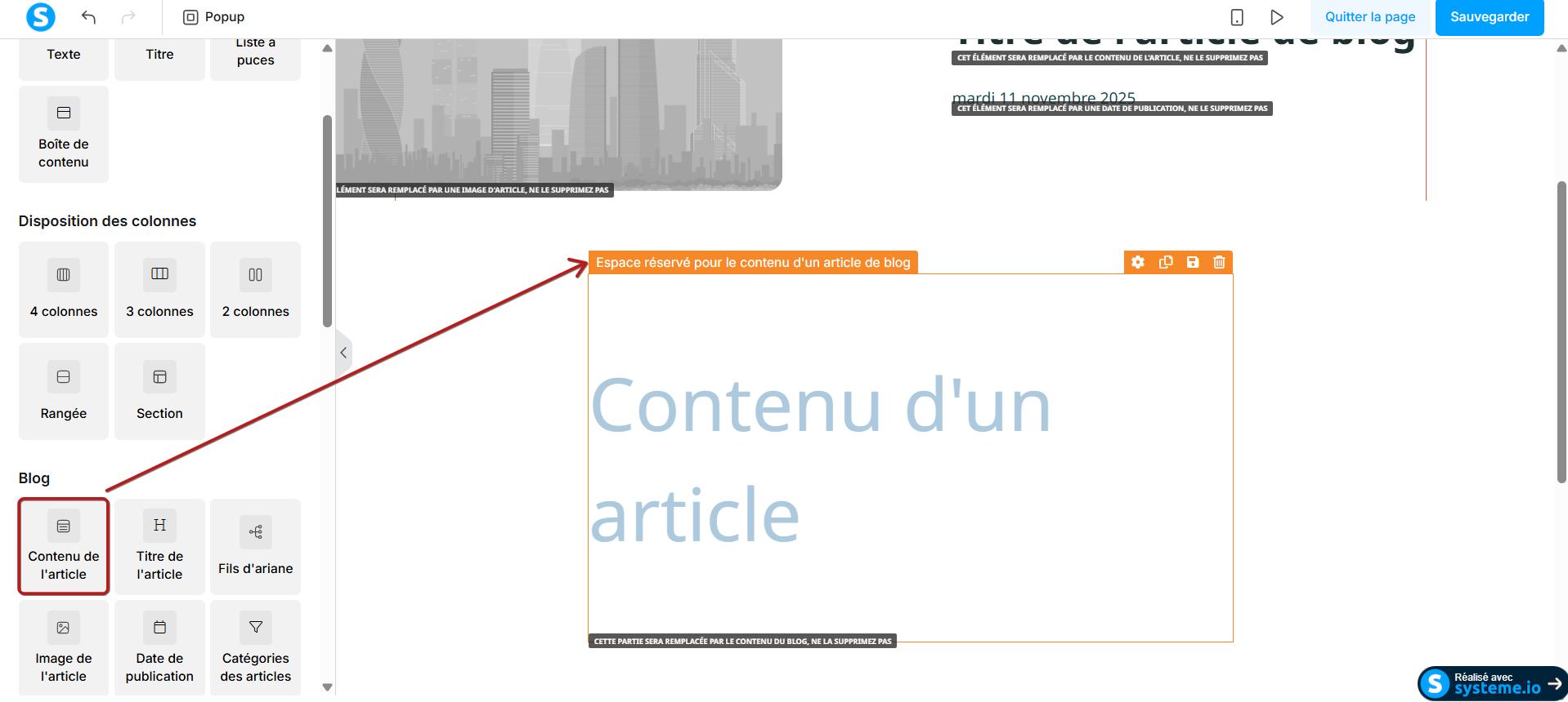 Vous pouvez aussi ajouter des éléments et des blocs qui seront affichés sur le modèle d'article à partir de l'éditeur.