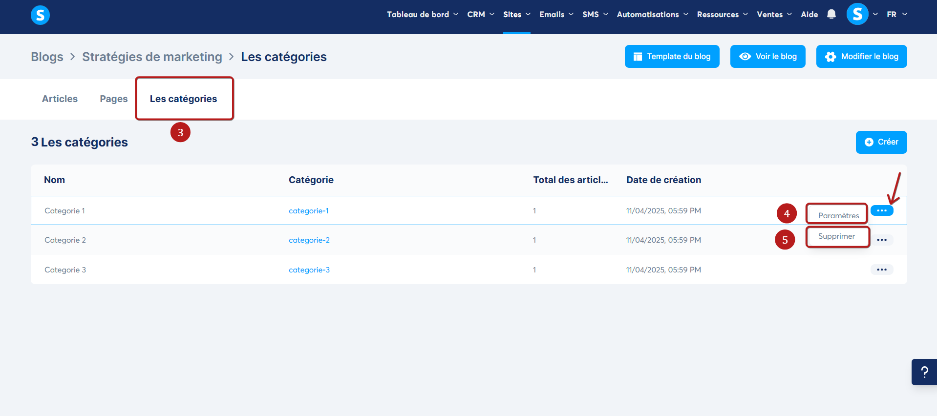 Lorsque vous avez créé votre blog, 3 catégories ont été automatiquement créées avec des noms par défaut. Pour renommer une catégorie, cliquez sur les 3 points (...), puis sur Paramètres (4). Pour supprimer la catégorie, cliquez sur Supprimer (5).