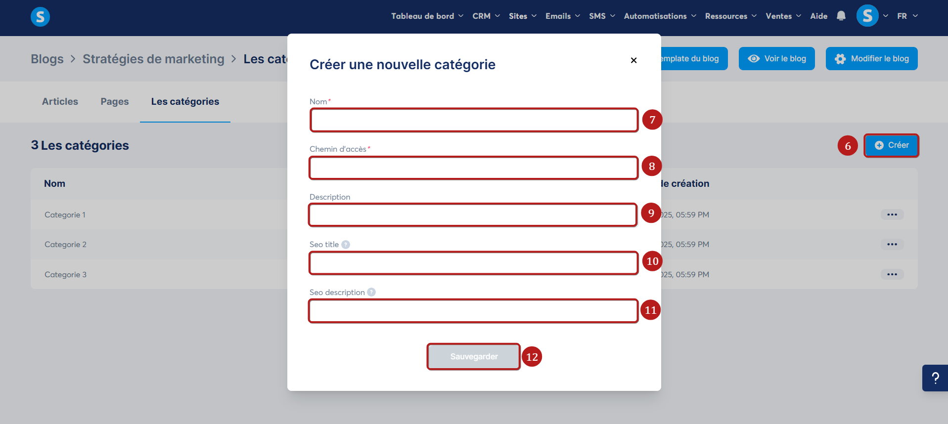 Pour créer une nouvelle catégorie de blog, il suffit de cliquer sur le bouton "Créer" (6), puis lorsqu'une fenêtre popup s'affichera, vous devrez remplir la fenêtre popup comme suit :
