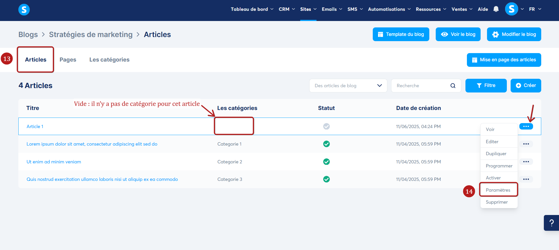 Pour ajouter ou modifier une catégorie pour un article existant, allez dans la section Articles (13), puis cliquez sur Paramètres (14).