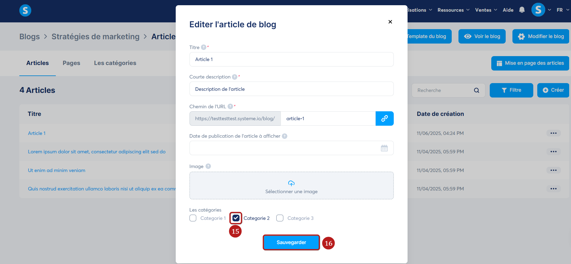 Dans les paramètres de votre article, cochez la case (15) de la catégorie que vous voulez ajouter, puis cliquez sur Sauvegarder (16) pour enregistrer les modifications.