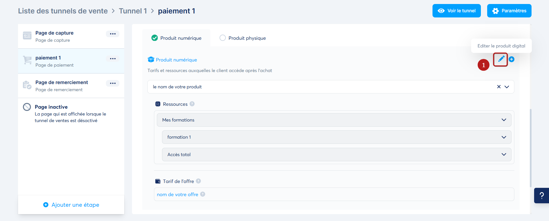 Pour supprimer un tarif existant, rendez-vous dans l'éditeur de la page de paiement concernée. Cliquez ensuite sur le bouton "Éditer le produit digital" (1).