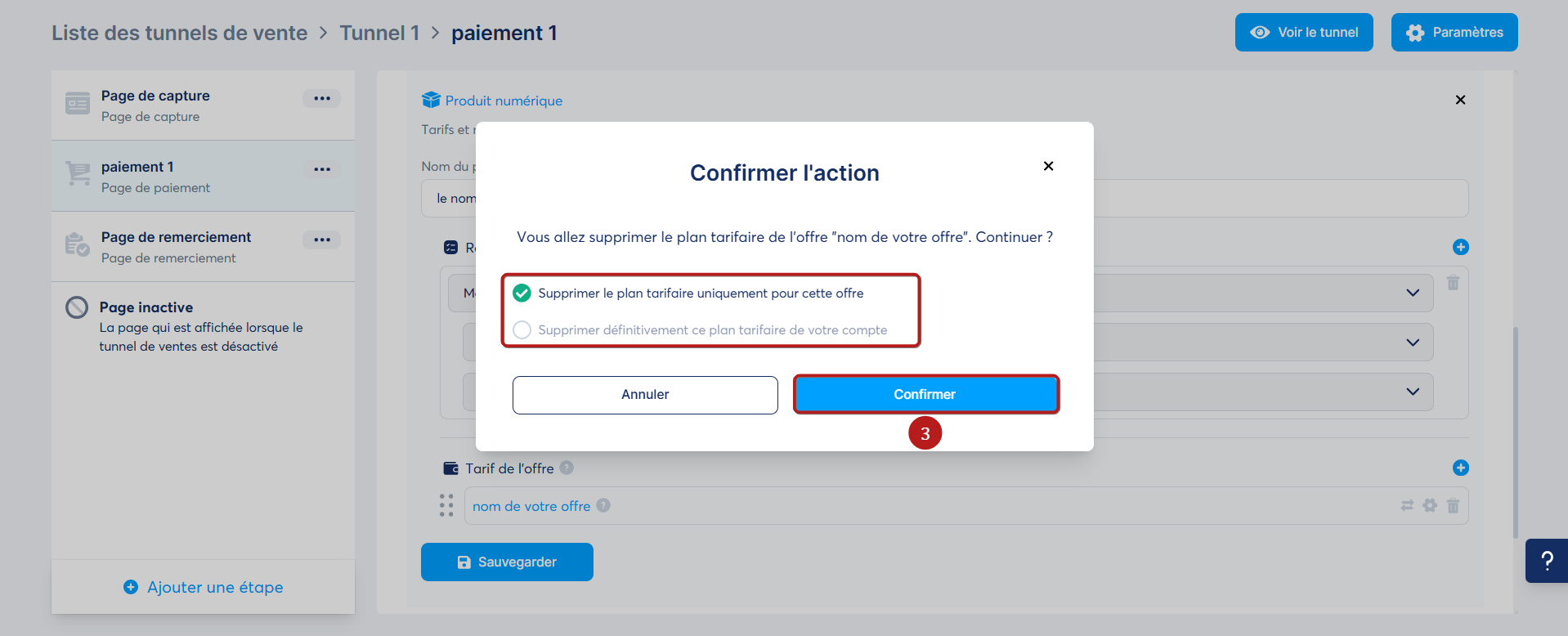 - Supprimer le plan tarifaire uniquement pour cette offre : retire le tarif de cette page spécifique seulement.