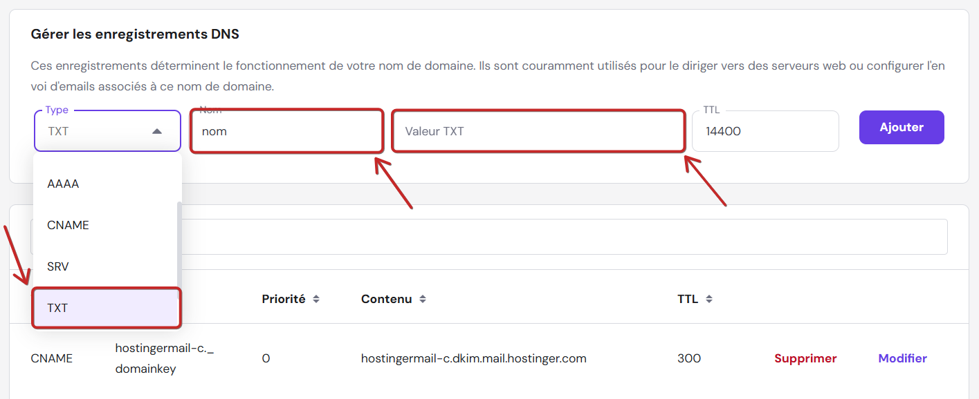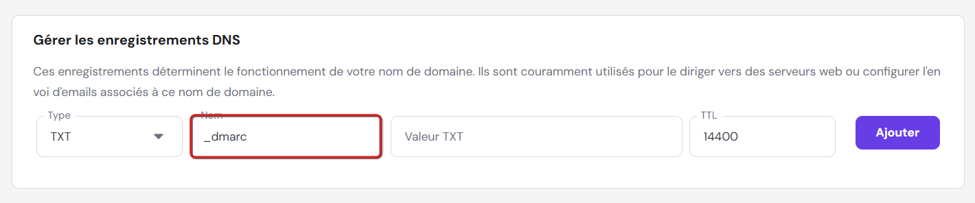 3. Saisissez la valeur de votre enregistrement. Voici un exemple de valeur pour DMARC :