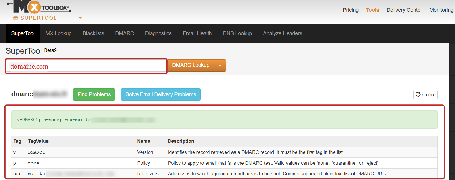 - Vous pouvez vérifier que votre enregistrement DMARC a bien été ajouté en faisant une recherche avec votre nom de domaine sur le site https://mxtoolbox.com/dmarc.aspx