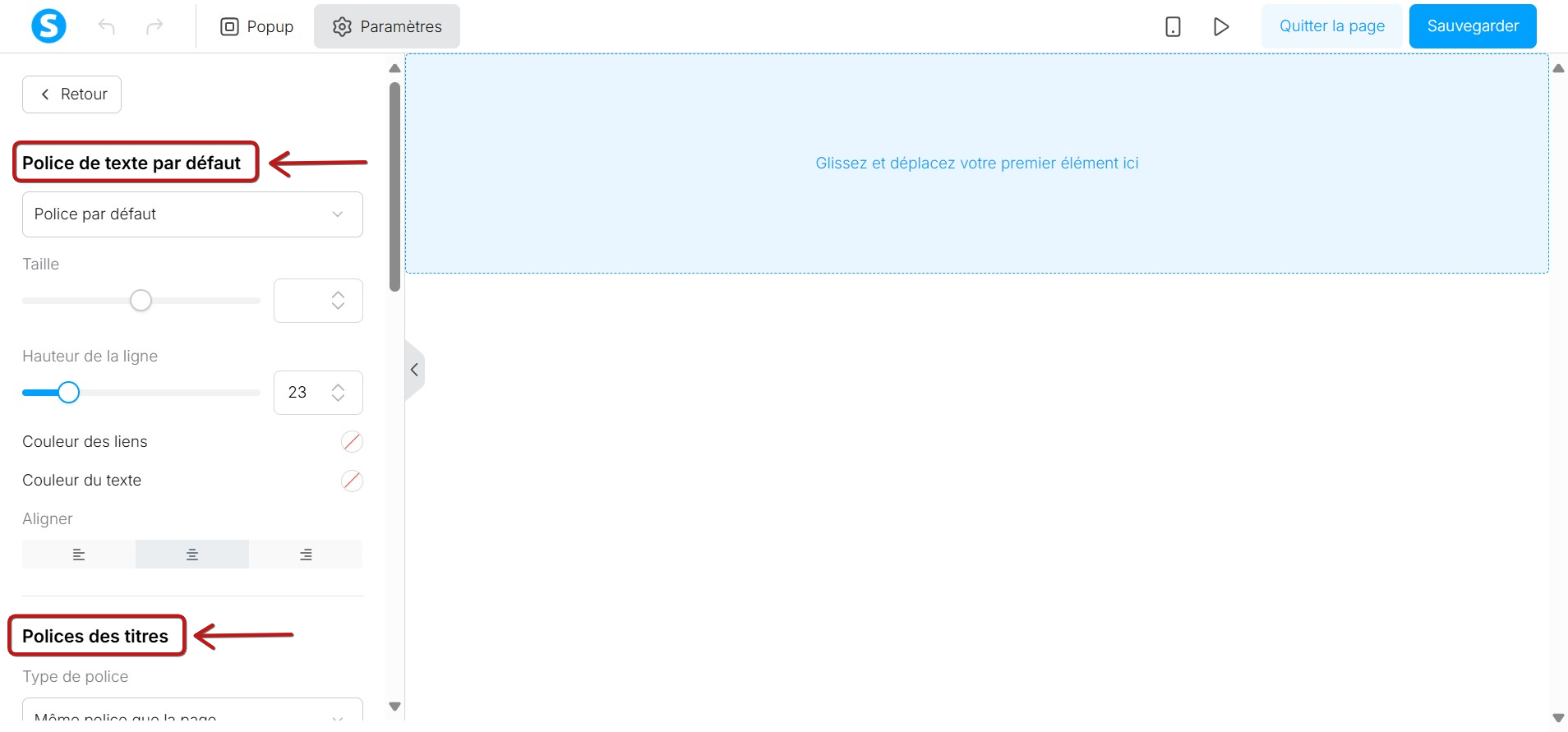 Dans l’éditeur de page, vous pouvez modifier la Police de texte par défaut et les Polices des titres, ainsi que glisser-déposer des éléments sur la page.