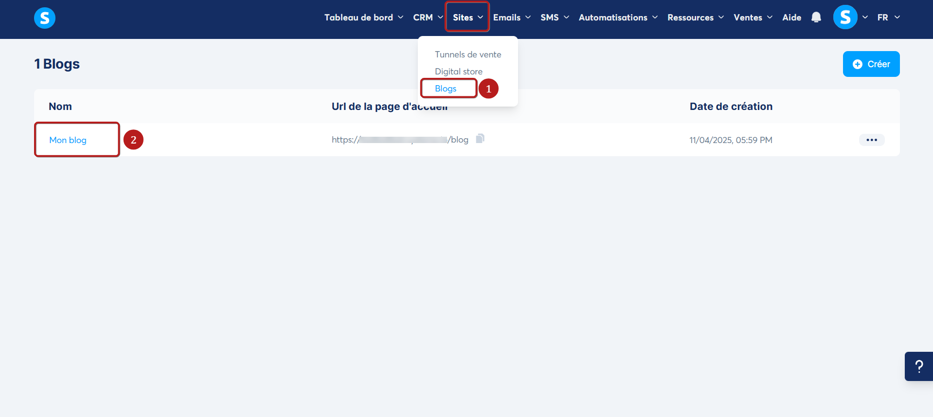Accédez aux Blogs (1) dans l'onglet Sites, puis cliquez sur le nom de votre blog (2).