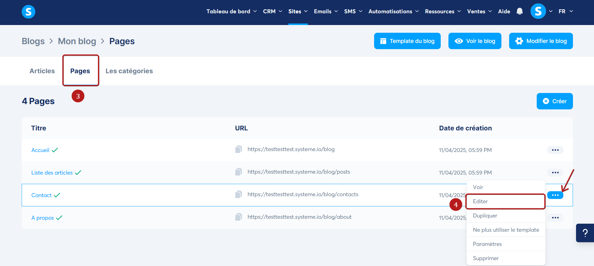 Vous remarquerez que 4 pages par défaut ont été créées lors de la création de votre blog, vous pouvez les modifier en cliquant sur Éditer (4) après avoir cliqué sur les 3 points.