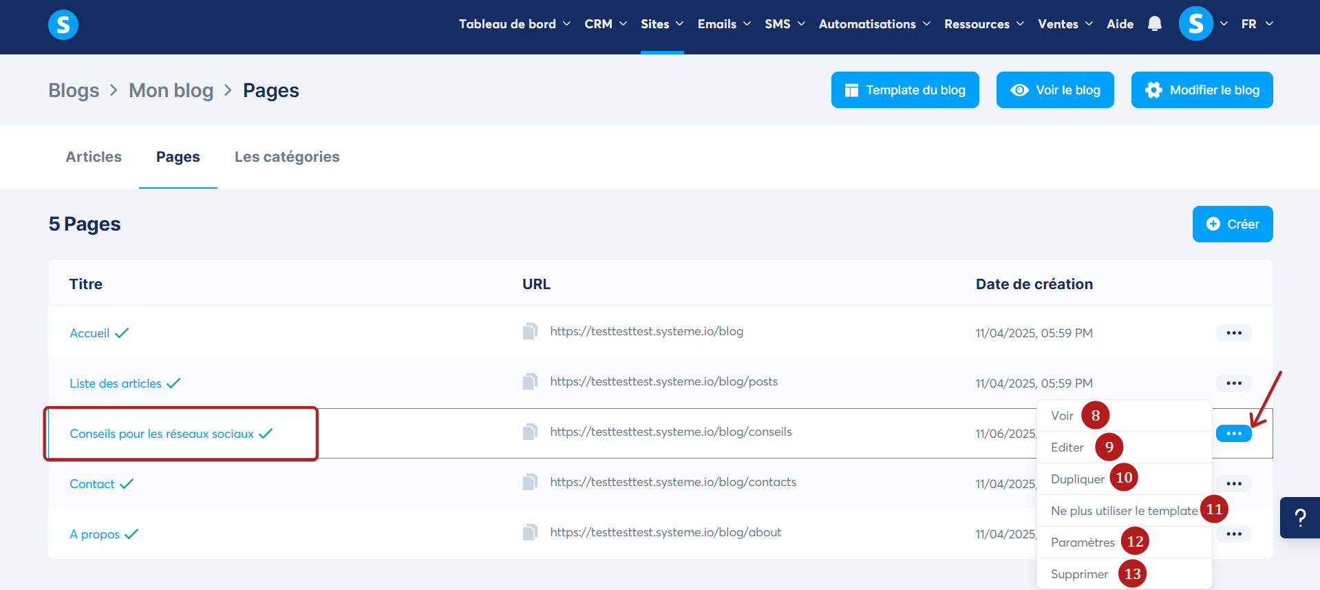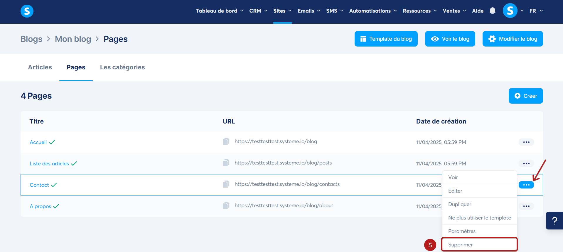 Remarque : Bien que vous puissiez supprimer les pages À propos et Contact (5), la page Accueil et la page Liste des articles sont requises par le système et ne peuvent pas être supprimées.